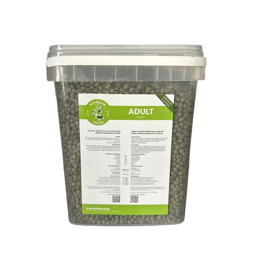 Koifarm Adult est un aliment flottant pour carpes koï avec une composition parfaite pour répondre aux besoins de base des koï adultes et pleinement développés. Un mélange entre un faible contenu en protéines et en énergie lié à une haute digestibilité et une grande quantité de minéraux constructeurs permet au poisson de développer sa corpulence. Koifarm Adult contient au total trois sources de protéines de haute qualité issues de farine de poisson, de farine de volaille et de farine d’insectes, ce qui assure une alimentation équilibrée et très savoureuse. Grâce à l’ajout de prébiotiques, le processus de digestion de l’aliment est stimulé et la résistance des koïs est augmentée. Koifarm Adult contient une quantité précise de spiruline sélectionnée (carotène) pour développer une coloration rapide et profonde et la maintenir sur le long terme. La qualité des ingrédients et la haute digestibilité limitent l’impact sur la qualité de l’eau.